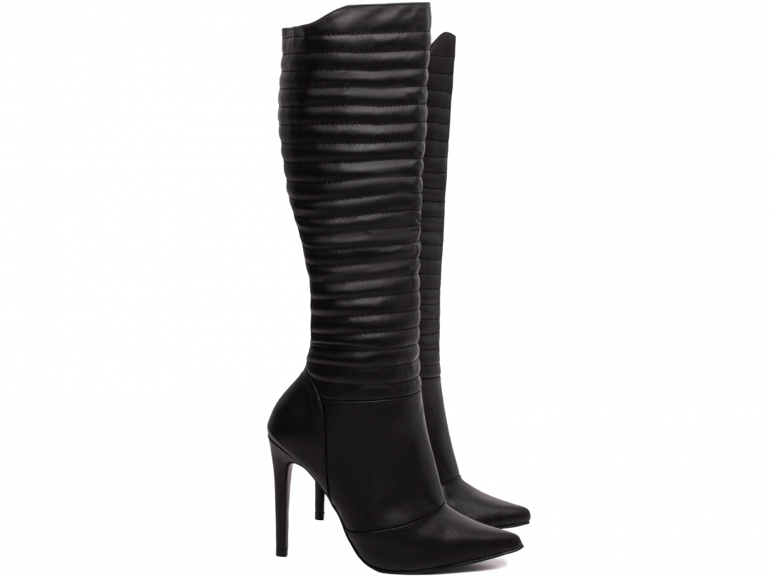 A Bota Bico Fino Salto 12 Cano Alto é confeccionada em material Napa na cor preta, apresentando acabamento texturizado com costuras em matelassê ao longo do cano. O fechamento é realizado através de um zíper posicionado na lateral interna, garantindo praticidade no calce e ajuste adequado à perna.