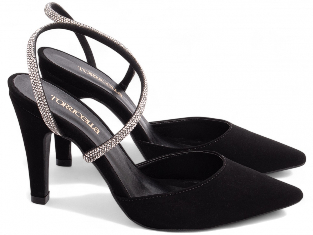O Scarpin Nobuck Preto Strass Prata Torricella é confeccionado em nobuck preto com aplicação de manta de strass prata no cabedal. O modelo possui salto fino médio de 9 cm revestido no mesmo material, solado em PVC preto com antiderrapante e estrutura fechada.