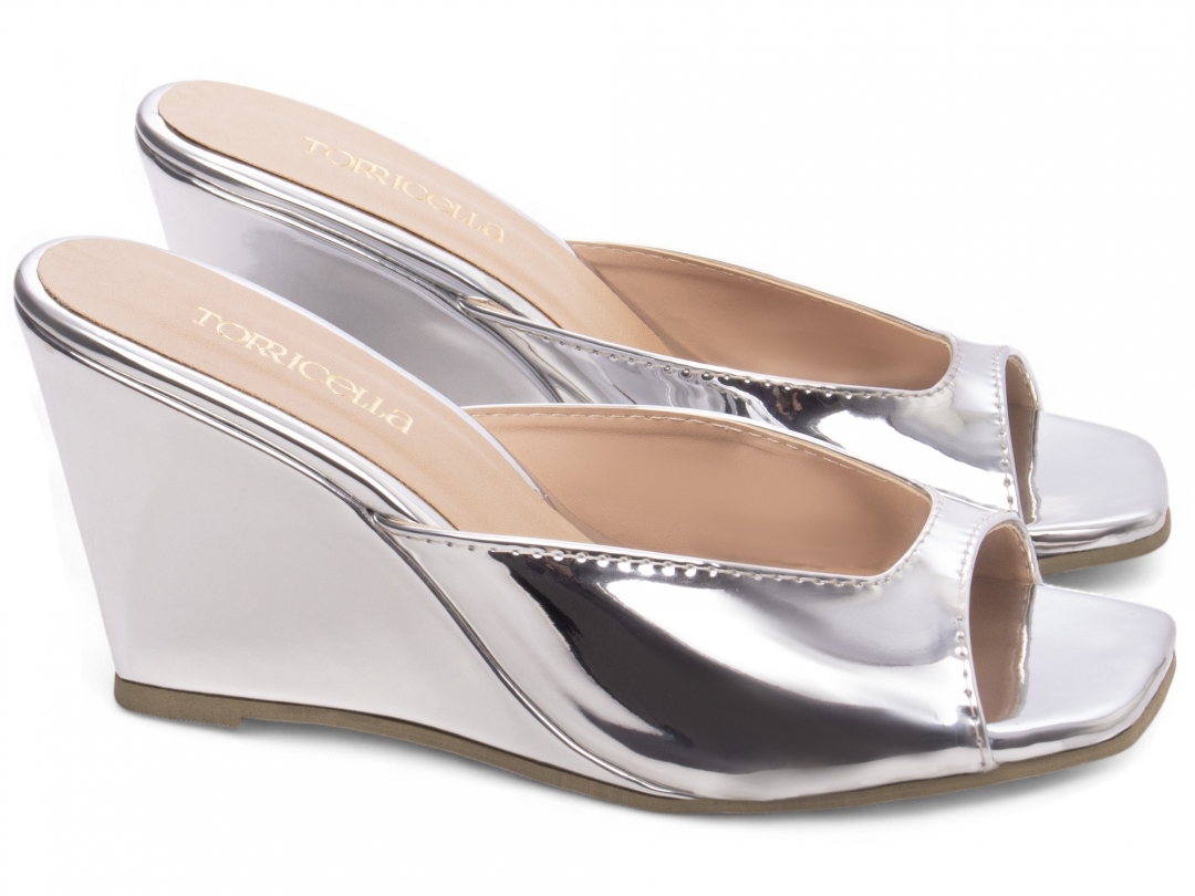 Invista na tendência metalizada com conforto absoluto. Garanta agora o seu Tamanco Prata Salto Cunha e destaque-se em qualquer ocasião.